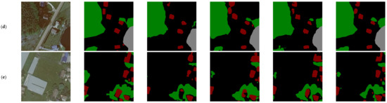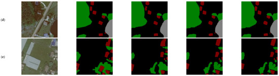 Local prediction of 1–4 sampling methods in the LandCover dataset, the meaning of colors is buildings (red), woodlands (green), water (grey), and backgrounds (black). (a–e) are the experimental results of 1-4 methods on images from the LandCover dataset.