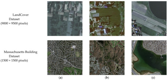 The Massachusetts building dataset consists of 151 aerial images of the Boston area, each of 1500 × 1500 pixels, covering an area of 2.25 square kilometers. In the Massachusetts building dataset, there are only two types: one is buildings, and the other is background. The whole dataset covers about 340 square kilometers [37]. The Massachusetts dataset is divided into 137 image training sets and 14 image verification sets. Compared with the LandCover dataset, the biggest feature of the Massachusetts building dataset is that the image pixels are only 1500 × 1500, while the image pixels of the LandCover dataset are 9000 × 9500 or 4200 × 4700. In the landcover dataset, there are three categories: vegetation, construction crops, and water body. The pixels of the two datasets are quite different. The training and prediction effects of the analysis model on different pixels are of great significance for studying the extraction of buildings in remote sensing images. Due to the different geographical locations of Massachusetts and Poland, there are big differences in geographical features and architectural styles. Figure 7 shows the comparison of the two datasets on the topography, in which the residents’ area, rural area, and seaside area in the two datasets are selected, respectively. Among them, the difference between the houses in residential areas is not great. In the rural area, Massachusetts has a higher terrain, not the flat terrain of Poland, which will also cause some interference to the feature extraction of the neural network. Poland, in the seaside area, is mainly composed of some factory buildings, which are scattered and can be easily distinguished. In contrast, the seaside in Massachusetts is mostly residential buildings, which are dense and difficult to partition.