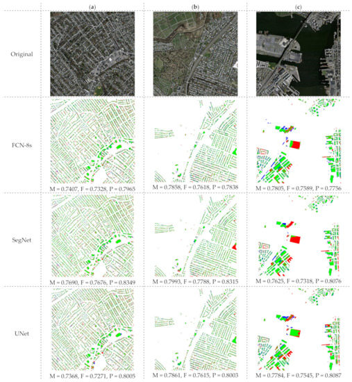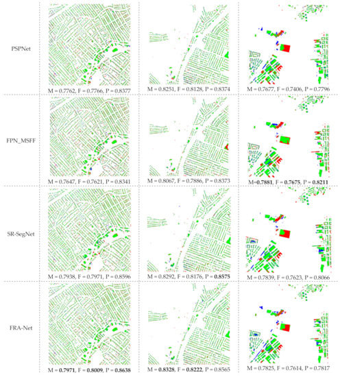 In order to further verify the effectiveness and generalization performance of the model proposed in this paper, the Massachusetts building dataset will be tested. We selected several representative areas, namely residential areas, rural areas, and complex areas, and received the prediction effect map as shown in Figure 8. In Figure 8, green represents true-positives (predicted as buildings, actual buildings); blue represents a false-positive (predicted as a building, but actually a non-building); white represents true-negatives (predicted to be non-building, but actually non-building); red represents false-negatives (predicted as non-buildings, actual buildings), M represents the mIoU, F represents the F1 score, and P represents the accuracy rate.