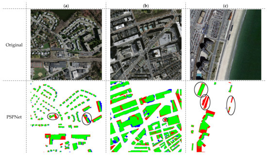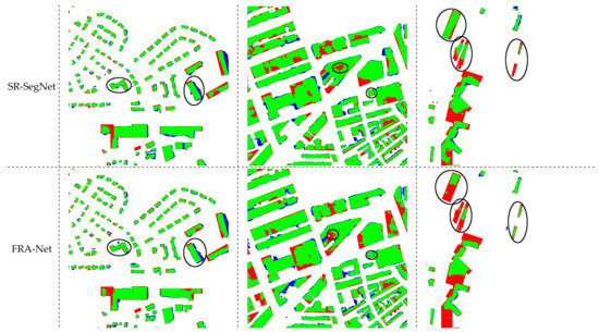 In Figure 9, green represents true-positives (predicted as buildings, actual buildings); blue represents false-positives (predicted as buildings, actual non-buildings); white represents true-negatives (predicted as non-buildings, actual non-building); red represents a false-negative (predicted as a non-building, but actually a building). In Figure 9a, the prediction of small-sized buildings in the Massachusetts building dataset is made. It can be found that the overall segmentation effect of the three models for small-sized buildings is still better, and most buildings can be accurately predicted. It can be observed in the black circled area in Figure 9a that for the yellow buildings in the original image, PSPNet missed a part of the detection, but the surrounding black and white buildings have been identified. In contrast, SR-SegNet and FRA-Net can perform good recognition, which also reflects that the generalization of these two models is better than PSPNet. Figure 9b shows the prediction effect of large buildings. There are more red and blue areas in the figure, indicating that the three models have more cases of missed and false detections. However, it is not difficult to find some details from the black circled area in Figure 9b. PSPNet missed the small size building next to the large building, while SR-SegNet and FRA-Net recognized this small size well. This shows, to a certain extent, that these two models can recognize buildings in more complex scenes. This may benefit from the symmetrical structure of the two models, which facilitates better recovery of the extracted features. In addition, the effect of PSPNet on building boundary restoration in Figure 9b is slightly better than that of SR-SegNet and FRA-Net. The scene in Figure 9c is more complicated, and the black circled area in the figure is part of the area that the three models missed. Because there are many distractors in this scene, such as cars and containers, and there are many irregularly shaped buildings, this makes the model judgment wrong, which is also one of the problems to be solved in the future.