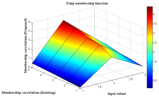 15], as the intersection of membership functions are not defined. In the simulation point, the input values are changed from 0.1 to 0.5, and for each point, membership correlation is checked. During the initial period, the correlation is below the value of 1, whereas, after setting the input values to 0.3, the membership of the proposed fuzzy set crossed 1, and it is defined as an intermediate correlation set. However, for existing models, the correlation is much higher, and the signal rate, in this case, will be maximized, thus leading to a high state of power consumption. Conversely, at the final input stage, the proposed method provides only 1.5 values of parallel association between input and output links.