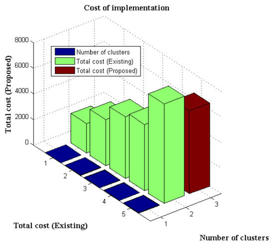 15] and proposed method. In this comparison, the case number of clusters is varied, thus increasing the cost of implementation from initial to last state. Consequently, the proposed method implements much lower cost as compared to the existing method, for which, in the initial demonstration state, the process building cost only 1000 dollars. Then, updating with a greater number of clusters added extra cost with beneficial systems to the public, varying up to 6500 dollars. Under the same circumstances, the existing method adds a total cost of 7800 dollars, which is much higher due to the surplus infrastructure in the integration process.