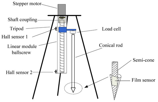Cone tip resistance and sleeve friction are two important measurement parameters in a CPT test [13,16]; however, the friction measuring device is complex and consists of several sophisticated components [40]. In order to simplify the measuring device and quickly obtain the CPT data, cone side pressure rather than sleeve friction was measured in our study. To obtain soil cone tip resistance and cone side pressure at different depths, a portable measuring device was developed (Figure 1). The device was mainly composed of a tripod, a ball screw slide table, a stepper motor, and a conical rod. The stepper motor was installed onto the tripod to ensure measuring stability. Its output shaft was connected with the screw of the ball screw sliding table through a shaft coupling to ensure good force transmission capability. During the operation of the device, the sliding table was driven up and down by the stepping motor, thus allowing the conical rod connected with the sliding block to penetrate the soil at a constant speed. To better penetrate the soil and measure the side pressure of the cone, the American Society of Agricultural Engineers (ASABE, St. Joseph, MI, USA) standard cones were modified by using two semi-cones to form a new cone. A film sensor was placed at the contact surface between the two semi-cones to measure the cone side pressure as the new cone penetrates the soil. The other end of the conical rod was linked to a load cell to detect the vertical penetration resistance of the cone, i.e., cone tip resistance.