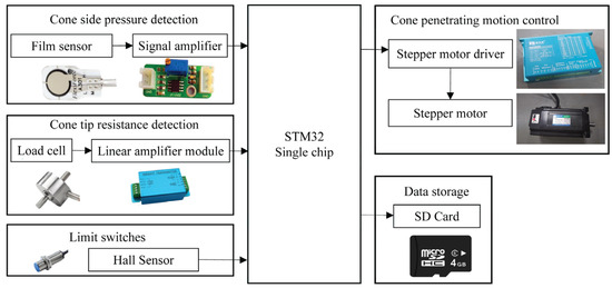 An automatic measuring and collection system was designed for real-time acquisition of sensor data and to control the movement of the conical rod (Figure 2). An STM32 single chip with type of STM32F103C8T6 provided by STMicroelectronics (Carrollton, Dallas, TX, USA) was used as the core processor for this system. A constant frequency control signal was given to the stepper motor driver by the output comparing mode of the timer inside the processor, which caused the stepper motor to rotate uniformly so that the cone-rod penetrated the soil at a consistent speed. Two Hall sensors with type of NJK-5002C provided by AOTORO (Yueqing, Zhejiang, China) were used as limit switches to ensure that the cone could reach the required penetration depth, and an SD card was used to store the output values of the sensors. The cone penetration depth (S) is calculated as follows [41]: