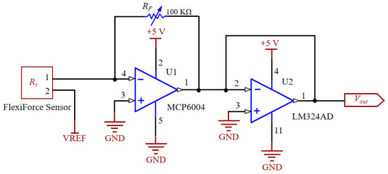 The sensor data were processed in parallel through a series of data processing units. The DYZ-101 sensor was powered by a 3 V power supply and can output 20 mV voltage signals under rated load (10 kN). The output signals from the sensor were linearly magnified by a magnifier and collected by the first interface of a built-in analog-to-digital converter (ADC) in the STM32 single-chip. Furthermore, the Flexiforce A301 sensor under action generated resistance-changing signals. For convenient data collection, these signals were processed by an MCP6004 power amplifier provided by Microchip Technology Inc. (Chandler, AZ, USA), and an operation amplifier LM324 was used to reverse the polarity of the signals (Figure 3). Hence, the output of the Flexiforce A301 sensor can be computed as follows: