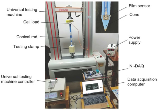 To validate the performance of the designed system, a testing clamp that matched the cone that was manufactured. Based on the universal testing machine (Figure 4), the load cell and the film sensor were calibrated through vertical loading force and side loading force, respectively. Eight loading forces (50, 100, 150, 200, 250, 300, 350, and 400 N) were applied in the calibration experiments. The data output from the sensor and the film sensor was stored on the SD card during each gravity loading.