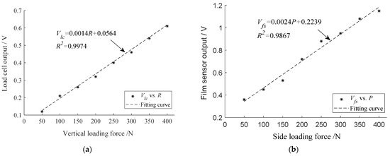 Sensor’s calibration test. (a) Load cell; (b) film sensor.