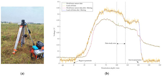 In Figure 6b, the sensors’ original data shows obvious ripples due to the vibration of the stepper motor and the difference in soil penetration resistance. The load cell signal ripple fluctuates more significantly than the film sensor ripple signal, which may be caused by the stepper motor transmitting the penetrating driving force in the vertical direction. To eliminate the ripple interference, we used the 20th-order median filtering method to process the sensors’ original data and obtain smooth curves; however, in this study, the calculation error may have come mainly from the filtering process. Because of the arithmetic rounding of the digital filter, some calculation error is inevitable [42]. By comparing the measured values with the filtered values, it was found that the average error between them is less than 3%, which is considered acceptable.