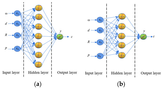 A BPNN was used in this study because it is the most widely used and effective neural network learning algorithm [45]. The preliminary architecture of the BPNN was determined as 4-h-1, where 4 is the number of input layer neurons representing R_max, P_max, ω, and d. The number of hidden layer neurons is represented by h, and 1 represents the number of output layer neurons. To eliminate the effects of coupling among dependent variables on the modeling performances of the model, we built BPNN prediction models for c and φ separately.