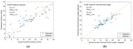 Soil shear strength parameters prediction of PLSR models. (a) Soil cohesion; (b) soil internal friction angle.