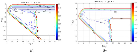 To determine the modeling parameters of SVR, grid searching and five-fold cross-validation were used to select a suitable combination of p and g. Figure 14 shows the results of the SVR model parameters. Based on the minimum MSECV, we preferentially selected the values of p and g, which were 0.25 and 0.64, respectively, for cohesion, and 32.4 and 0.20, respectively, for internal friction angle.