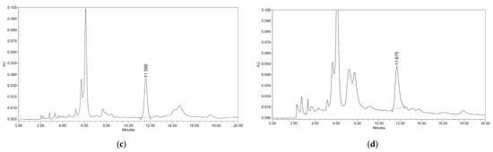 A UV spectrum of the dieckol and ESE is shown in Figure 1a. As a result, by comparing the chromatograms of dieckol, ESE and ESETM, it was confirmed that the dieckol was separated without interference from other substances. The peak retention times of the dieckol, ESE and ESETM are identical (Figure 1b–d).