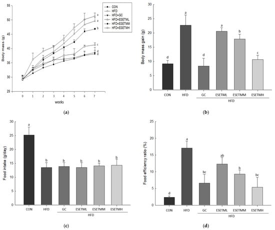 Effects of ESETM supplementation for 7 weeks on body mass (a), body mass gain (b), daily food intake (c), and food efficiency ratio (d) in ICR mice fed high-fat diet (HFD). Data are shown as the means ± standard deviation (SD) (n = 5). Different lower case letters above columns indicate statistical differences at p < 0.05.