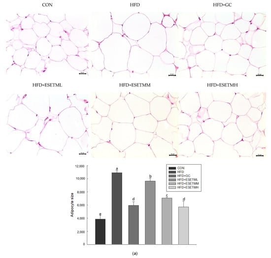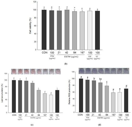 Effects of ESETM supplementation for 7 weeks on adipocyte size (a) in ICR mice fed high-fat diet (HFD). Cell viability (b), lipid accumulation (c) and relative ROS production (d) from 3T3-L1 adipocytes treated with ESETM. Data are shown as the means ± standard deviation (SD) (n = 5). Different lower case letters above columns indicate statistical differences at p < 0.05.