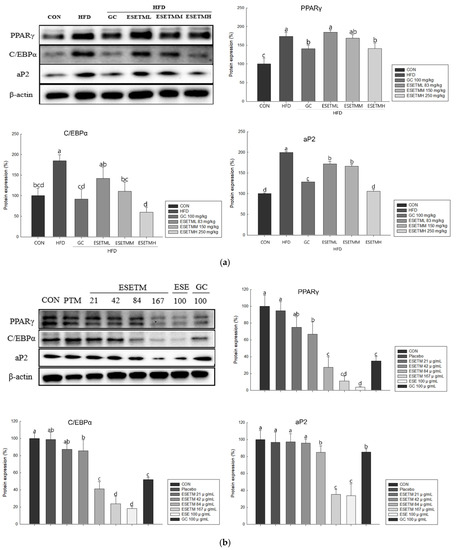 Effects of ESETM on adipogenic protein expression in ICR mice fed HFD after 7 weeks and adipocytes treated with ESETM. (a) Western blots of adipogenic proteins in WAT. (b) Western blots of adipogenic proteins in 3T3-L1 adipocytes. Data are shown as the means ± standard deviation (SD) (n = 5). Different lower case letters above columns indicate statistical differences at p < 0.05.