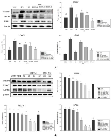 Effects of ESETM lipogenic protein expression in ICR mice fed HFD after 7 weeks and adipocytes treated with ESETM. (a) Western blots of lipogenic proteins in WAT. (b) Western blots of lipogenic proteins in adipocytes. Data are shown as the means ± standard deviation (SD) (n = 5). Different lower case letters above columns indicate statistical differences at p < 0.05.