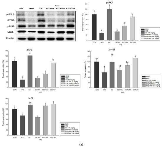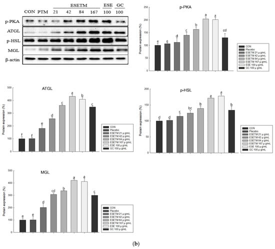 PKA, ATGL, HSL, and MGL act as enzymes that break down triglycerides into fatty acids and glycerol. As PKA becomes phosphorylated and activated during lipolysis, ATGL decomposes triglyceride into diglyceride (DG), which is then decomposed by phosphorylated HSL into monoglyceride (MG). Finally, MGL decomposes MG into fatty acids and glycerol []. Therefore, we performed Western blot analysis to determine whether ESETM affects PKA phosphorylation and upregulates the expression of lipolytic enzymes to stimulate lipolysis. As shown in Figure 6a, ESETM administration significantly increased the p-PKA and the levels of lipolytic enzymes in the WAT in a dose-dependent manner. The protein expression of lipolytic enzymes (p-PKA, ATGL, p-HSL, and MGL) also increased in a dose-dependent manner in 3T3-L1 adipocytes treated with ESETM (Figure 6b). The results shows that ESETM promoted lipolysis in adipocytes by inducing the phosphorylation of PKA and increasing the expression of lipolytic enzymes.