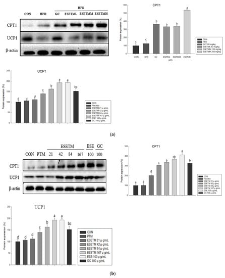 Expressed in the inner mitochondrial membrane, UCP1 is a hallmark brown adipocyte protein responsible for the energy-expending phenotype of brown adipose tissue. Furthermore, increased UCP1 expression suggests that mitochondrial activity is critical for the browning effect, and its expression in WAT drives the development of brown adipose tissue-like features [,]. Western blot results showed that ESETM increased dose-dependent thermogenic gene expression (UCP1) in high-fat diet-fed mice in the present study. Furthermore, ESETM promoted the expression of CPT1, an enzyme that facilitates the transfer of free fatty acids into mitochondria, the rate-limiting enzyme for β-oxidation, and the expression of UCP1 and CPT1 also can promote fat browning. Similarly, ESETM also promoted the expression of these UCP1 and CPT1 in adipocytes. As a result, by increasing the expression of these proteins, ESETM may increase energy expenditure. These findings shows that ESETM may increase energy expenditure by upregulating the expression of thermogenesis and browning in HFD-fed obese mice.