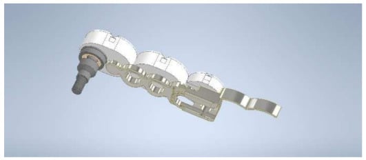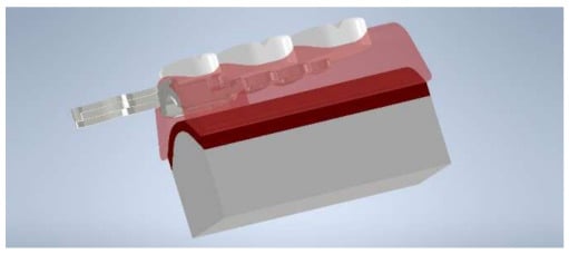 The 3D Model of the metal reinforcement, artificial teeth and distal implant.