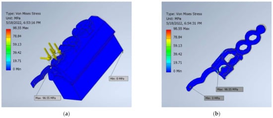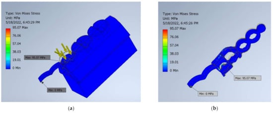 Maximum von Mises stress in classical unilateral RPD when the forces were applied on the PM2: (a) full analyzed assembly; (b) metallic reinforcement.