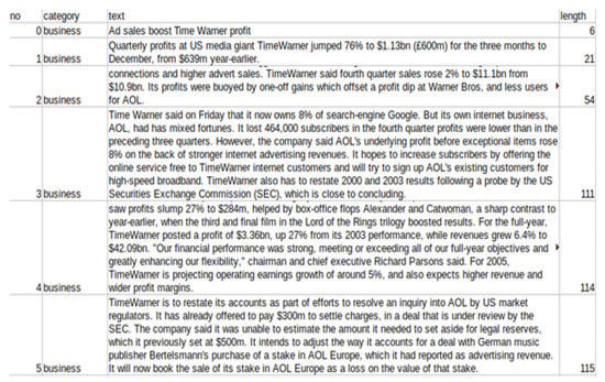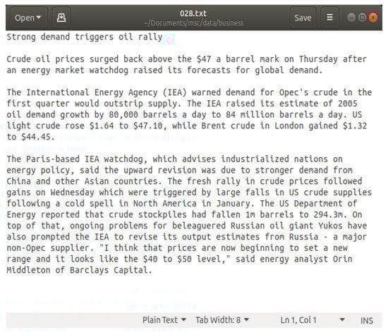 The entire calculation was performed on a dataset derived from a news database on the BBC website of the five most popular news categories from 2004 to 2005 [15]. This collection contains 2225 documents, each of which was assigned to one of the categories: “business”, “entertainment”, “politics”, “sports”, or “tech”. Each document is a separate (*.txt) text file assigned to a directory structure that defines the category membership. Pre-processing of these documents allowed us to extract 12,162 texts forming the basis for the calculations. All of the extracted texts were used in the comparison. These data are much more than the text documents due to the fact that a single document contained several unrelated messages separated by multiple newline characters. One example text document is shown in Figure 1.