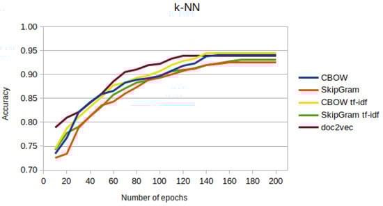 On the other hand, the method that needed the least number of epochs to obtain an invariant efficiency result is the Distributed Memory—Paragraphs Vectors method. It takes only 112 epochs for the k-NN method and 125 epochs for the Naive Bayesian Classifier. This short time, compared to the Skip-gram tf-idf method mentioned earlier, may be due to directly creating vectors based on whole texts rather than first creating vectors of words and then creating vectors of texts based on those vectors. This approach allows the machine to detect relationships within whole texts earlier, which are not as obvious for word-based methods. In addition, this method obtained performance results significantly higher than the other tested methods from the very beginning. Hence the relative value of the obtained performance was lower with a similar absolute result.