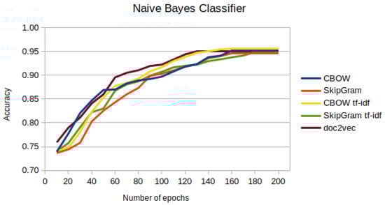 Another aspect worth noting is the course of effectiveness values depending on the epoch. Irrespective of the method of text classification, the course of these functions was similar. In the early epochs, the accuracy values increase faster, while already around the 100th epoch, the effectiveness differences in subsequent epochs are not so large. Interestingly, the method with the worst performance also starts with the lowest score. However, what the initial classification score is is in no way an indicator of whether the method will work. This can be seen in the CBOW method. In the initial epochs, the accuracy score using this method is second-worst, while after getting its best accuracy score, it is the second-best. Consequently, this means that it is impossible to unambiguously decide whether the method will work in the case under study (cannot decide on the effectiveness of the method by analyzing the initial results).