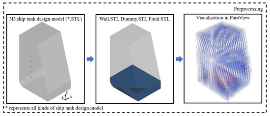 - Pre-processing stage. Based on the 3D design data of ship tanks, the computational domain is firstly discretized into fluid particles. Meanwhile, two kinds of solid particles are arranged to satisfy the solid boundary condition. After that, the particle information, including position, velocity, acceleration and pressure, etc. and calculation parameters, including initial particle distance, operator support distance and time step, etc., are initialized. The flow of preprocessing is illustrated in Figure 1.