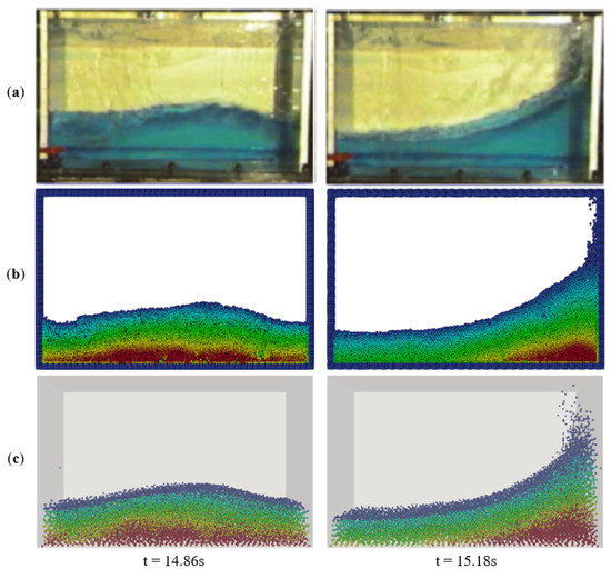 Comparisons of the numerical simulation results of the free surface profiles at time 14.86 s and 15.18 s with that of the experiments given by [60] are illustrated in Figure 3. From this figure, it can be seen that both the 2D and the 3D numerical simulation results make good agreement with the experimental results.