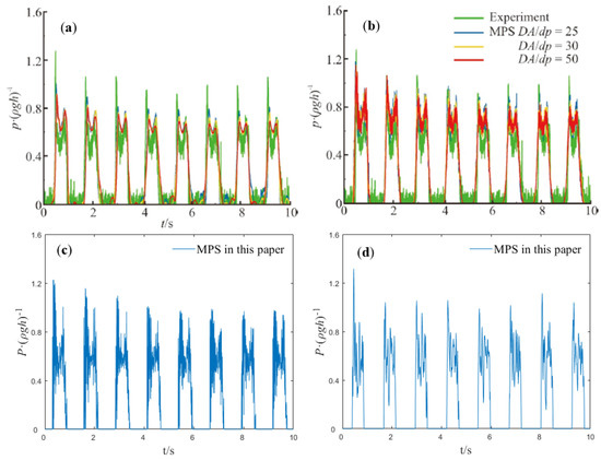 The simulation conditions are set according to [60]. The length, width, and height of this tank are m, m, and m, respectively, and the water depth is set to m. This tank sways harmonically under the external excitation , where A is amplitude of sway ( m) and is excitation frequency ( rad/s). Meanwhile, a probe is arranged at the middle of the wall perpendicular to the excitation direction and is m away from the tank bottom. For computation parameters, the initial particle distance is set to m, the time step is s, and the density of fluid is 1000 kg/m.