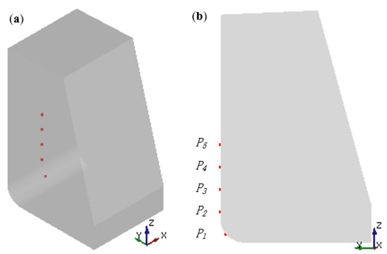 Illustration of the particular points on “R2.03AP”. (a) custom view; (b) lateral view.