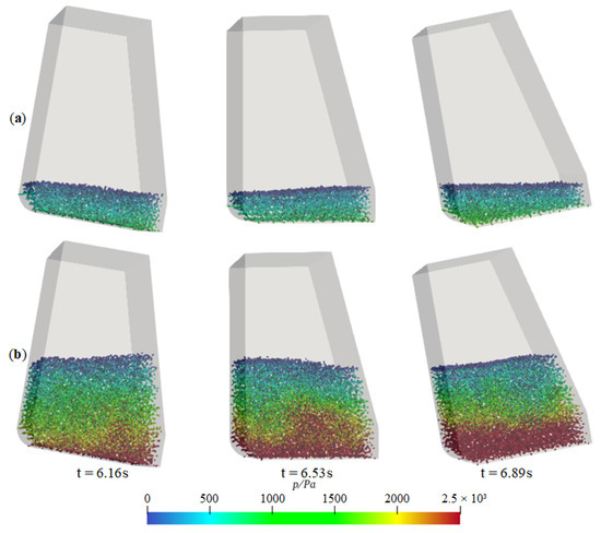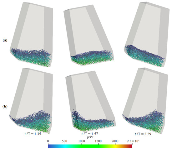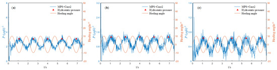 Figure 10 gives the comparison of hydrostatic pressure with the dynamic pressure at three particular points, namely , , and , in case 2. It should be noted that the method is adopted to determine the height of the liquid surface of the tank under different ships’ rolling angles to calculate the hydrostatic pressure [64]. From this figure, it can be seen that the maximum dynamic pressure is bigger than hydrostatic pressure in all three of these points, even 38% at .