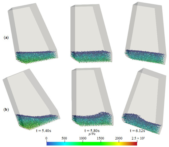 Figure 8 gives the comparison of snapshots at several typical time steps under case 1 and case 3. Both of these cases have the same rolling period, 1.45 s, and filling height is 100 mm, but different maximum rolling angles. The maximum rolling angle in case 1 is , while in case 3. From this figure, it can be seen that the phenomenon of fluid accumulation, bending, and slamming on a free surface occurs in case 3, but not in case 1. Therefore, it can be concluded that a larger rolling angle would induce a more violent liquid sloshing in the ship tank.