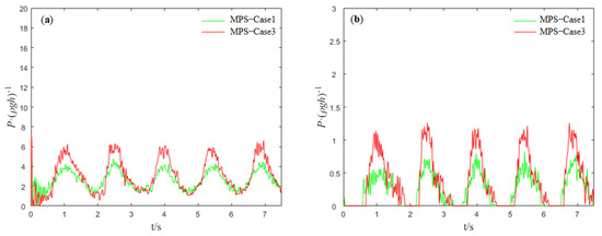 Comparison of dynamic pressure at different rolling angles in case 1 and case 3 at two probes. (a) ; (b) .