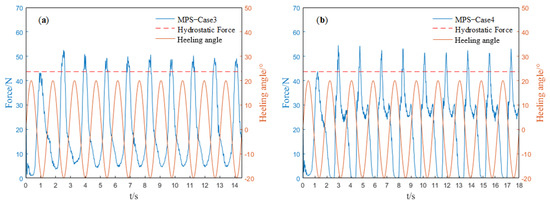 Figure 12 gives the comparison of the sloshing-induced forces on the port sidewall of the tank in case 3 with that in case 4. In addition, the hydrostatic force is marked as a red dash line. From this figure, it can be seen that the peaks of sloshing-induced force in both cases are bigger than hydrostatic force, even 20% in case 4. Furthermore, the maximum sloshing-induced force in case 4 is larger than that in case 3. These results can also be seen by the fact that the high pressure area in case 4 is wider than that in case 3, as illustrated in Figure 9. Meanwhile, a bigger sloshing-induced force would be expected when liquid sloshing is more violent since the liquid sloshing in case 4 is more violent than in case 3. Therefore, it could claim that the sloshing-induced force is not positively correlated with the ships’ undamped natural rolling frequency.