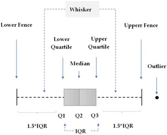 The dash lines stretching from both the box’s sides are named the “whiskers”, used to indicate variability outside both quartiles. The corresponding lengths are obtained by (lower fence) and (upper fence). Typically, outliers are plotted as individual dots beyond the fences. Additionally, boxplots can be drawn either vertically or horizontally [16]. Figure 1 shows the horizontal form of a boxplot.