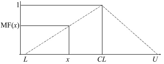 When the domain bounds of observations are obtained, the possible sample distribution can be demonstrated by drawing a triangular membership function (MF), using L, Q2, and U to represent it, as shown in Figure 5. The reason to take Q2 (or the median, Me) as the central location is that it is more sensitive than the average (or mean) when sample sizes are small. The MF is formulated as: