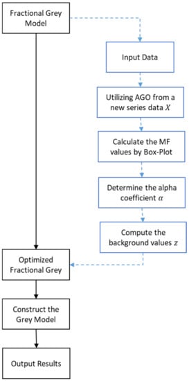 The grey model (GM) was first proposed to deal with the issues concerning uncertainty and insufficient information form short-term time-series data [4]. It aims to make predictions based on few-shot datasets and is the foundation of grey system theory. The GM (1,1) model is the most common and basic model. The features include the low requirement of population data, is easily operated, and includes the low loading of calculations [5]. The main concept is to detect the underlying patterns from the collected data with an accumulated generating operation (AGO), which processes sample data indirectly [6]. The grey models based on the fractional order model (FGM) has been proven to be a better method than the traditional GM, while the fractional order-r value is set in a continuous real number space [7,8,9,10,11]. In the past, much research used heuristic optimization algorithms, such as genetic algorithms and particle swarm optimization, etc., to improve the accuracy of predictions [5,9,11,12,13,14]. In this paper, we focus on how to improve the FGM by revealing a new fractional grey prediction model, which uses box-and-whisker plots to estimate the trend of data, known as the box-plot-based fractional scale prediction model (boxplot-based FGM, BP-FGM), to improve the accuracy of predictors by setting the coefficient sets of background value α in a traditional grey model.