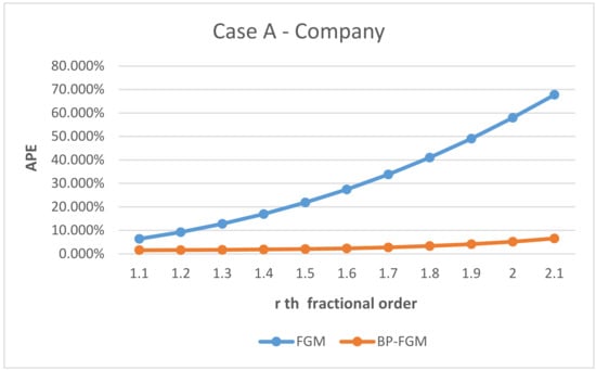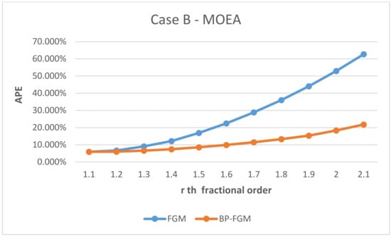 The experiment results from the data of the company and MOEA are summarized in Table 3, where the errors are MAPEs (mean absolute percentage error) calculated by Equation (15). The detailed results are shown in Figure 7, Figure 8 and Figure 9, where the errors are APEs (absolute percentage error) commutated by Equation (14) for 11 fractional orders that start from 1.1 to 2.1. The lower the APE values, the higher the indication of prediction accuracy.