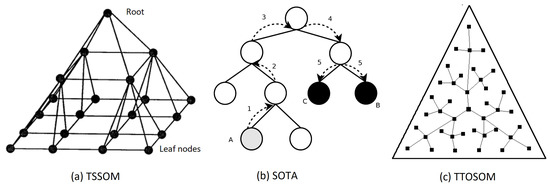 Examples of hierarchical orderings are as follows: BTASOM (binary tree TASON) [44], where a binary tree is created, each node being a model of type TASOM (time adaptive self-organizing map), which is a SOM-derived algorithm that has variable learning rates and neighborhood size, and can reflect changes in the environment as per the latest input during model training [45,46]. SOTA (self-organizing map tree map) [47,48] has its neurons internally distributed similarly to a binary tree, with one node being considered the most important according to defined criteria, and the others organized below. GHTSOM (growing hierarchical tree SOM) 49] performs hierarchical model growth according to the variation of the weights in the neurons. TTO-SOM (tree-based topology-oriented SOM) [50] organizes neurons in a predefined tree structure, with free growth defined by the relationships between neurons and their neighborhoods. As far as pyramid arrangement is concerned, an example is TSSOM (tree-structured self-organizing maps) [51,52], where a multidimensional SOM has its dimensions organized in a pyramid shape using the TSVQ algorithm (tree-structured vector quantization). The topologies of some tree SOMs are exemplified in Figure 1, where (a) TSSOM, (b) SOTA, and (c) TTOSOM.