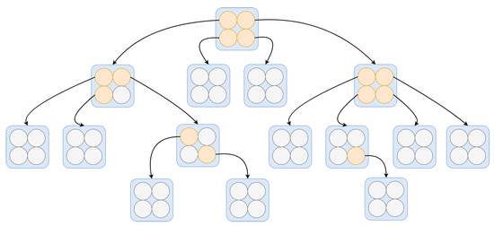 The architecture of TESSOM is illustrated in Figure 2. Note that on the first level of the structure the map has a 2 × 2 structure. This is due to the fact that when considering a rectangular lattice, these are the smallest dimensions that can be configured. The structuring levels of the tree are created from each neuron, and always with the same 2 × 2 dimensions. That is, a root neuron will be subdivided in the next level, where all notes have the same 2 × 2 dimensions. In Figure 2, neurons that are within the parameters for expansion are identified in orange, and neurons that do not meet one or more parameters are identified in gray, indicating that those are “leaf” neurons; hence, they do not generate expansion. The justification for this configuration is based on algorithms for binary or quaternary trees. It is believed that in future works it will be possible to study other types of map dimensions.
