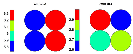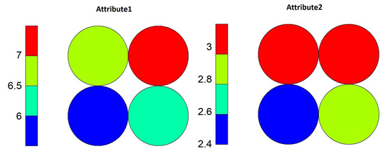When analyzing the contributions of the variables in the neurons of this model (Figure 8), we see something different from what happened with the level 1 model. The neuron that presented the lowest entropy obtained the approximation of the objects mainly via combination between high values for “Attribute1” and low values for “Attribute2,” and the variable with higher entropy had similar participation by both variables.