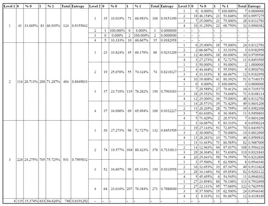 The neuron 2 data subset allowed the generation of a new SOM model, which produced the values presented in Table 2. In this model, neuron 4 had the lowest entropy, presenting one object from the minority class and five from the majority class. However, since Equation (1) considers the relationship between the classes, the value remains high, at . Neuron 2 showed the highest level of entropy, at .