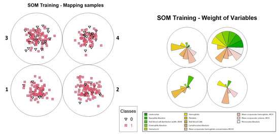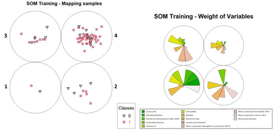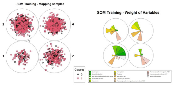 The second source of motivation was the idea of attempting to exploit SOM in a similar way to AI algorithms based on decision trees, such as random forest and XGBoost. These algorithms analyze each variable of a dataset (in this case, CBC variables) in order to model the best combination of these factors based on the entropy measurement in order to maximize the accuracy for diagnosis prediction. These models may provide a clearer understanding on how a decision is made, through the interpretation of the variables in order of relevance from the top to the bottom of the tree. Disadvantageously, although the relevance of each variable can be discovered, the algorithm in many cases ends up selecting a set of variables which does not allow a complete analysis of the variables and their relationships. Furthermore, these algorithms are sensible to class imbalance, which we knew could be a disadvantage in the context of this work. For this reason, techniques to obtain balance between classes were used to introduce artificial data, generated specifically for this purpose, that did not come from actual patients.
