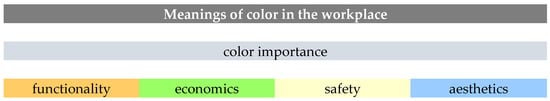 | Cold colors | Green, blue, blue-green, and their shades | Soothe, provide visual relief, promote mental concentration, and maintain constant performance | In work areas where excessive temperatures occur, e.g., bakeries |