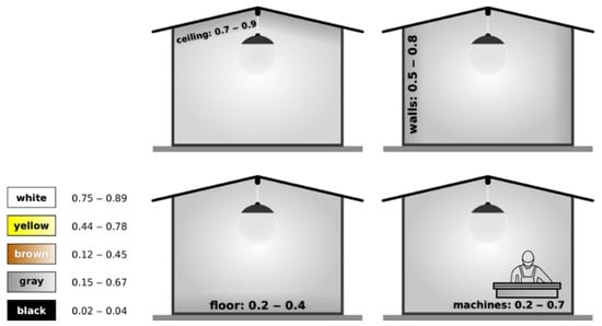 | Ceiling | 0.7–0.9 | White | 0.75–0.89 | Floor | 10% |