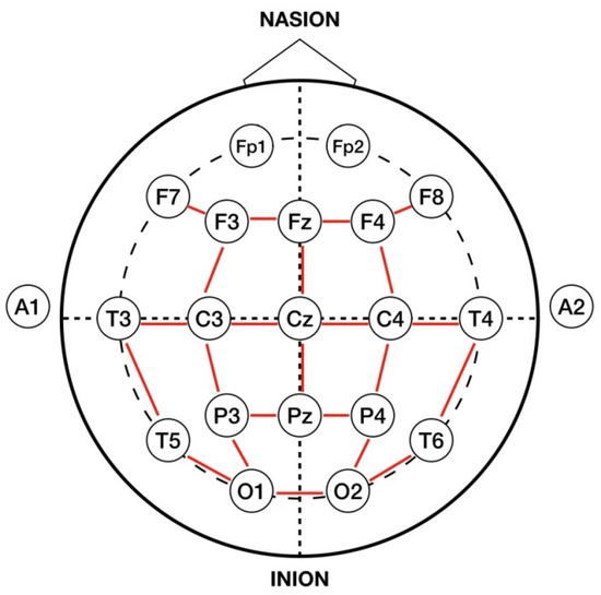 The participants’ EEGs were recorded using the International 10–20 system [25]. To reduce volume conduction effects from a common reference [26], 23 bipolar derivations were used in this study. Figure 1 gives an overview of the electrodes and bipolar channels. More specifically, the following bipolar channels were used: F8-F4, F7-F3, F4-C4, F3-C3, F4-FZ, FZ-CZ, F3- FZ, T4-C4, T3-C3, C4-CZ, C3-CZ, CZ-PZ, C4-P4, C3-P3, T4-T6, T3-T5, P4-PZ, P3-PZ, T6-O2, T5-O1, P4-O2, P3-O1, and O2-O1. These bipolar channels are the most commonly used in clinical practice [27]. During the recording, the participants were instructed to reduce their movements and not to think of anything in particular (i.e., resting state EEG).