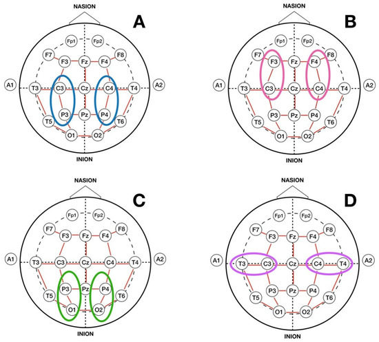 Homotopic Pair Connectivity was computed by focusing on certain pairs of bipolar derivations that were homotopic in the left and right brain hemispheres (mirror areas of the brain hemispheres). Based on previous classifications [30,31], four pairs that have been, in part, shown to be most affected by Alzheimer’s disease were selected. These pairs are depicted in Figure 2. Pair A consisted of the homotopic pair located in the centro-parietal region of the brain (C3-P3 and C4-P4). Pair B corresponded to the pair in the fronto-central area (F3-C3 and F4-C4), Pair C consisted of electrodes located in the parieto-occipital region (P3-O1 and P4-O2), and Pair D consisted of electrodes placed in the centro-temporal area (C3-T3 and C4-T4). For each pair, the PLV was computed in the five frequency bands and a Mann Whitney U–test was carried out to compare the band-specific PLVs between the two AD and HC groups.