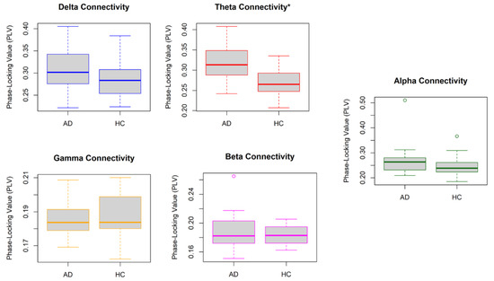 The average PLVs obtained from all connectivity pairs for the five frequency bands (global connectivity). Plots marked with * indicate a statistically significant difference (p < 0.05) between AD patients and HCs.