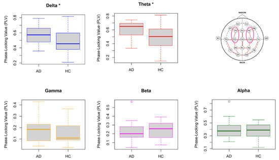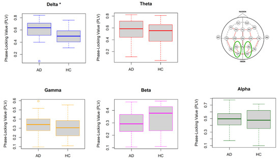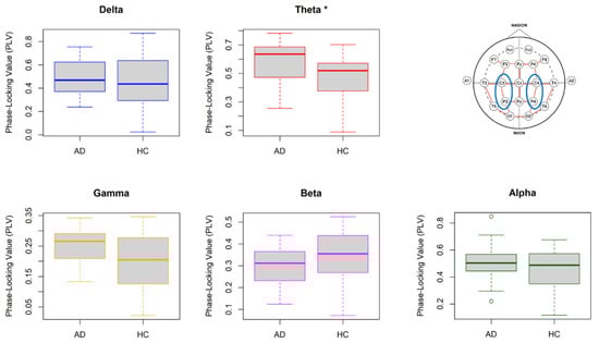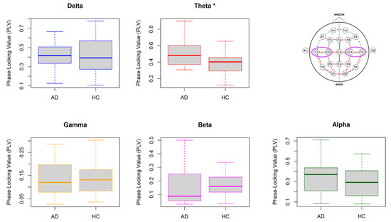 The PLVs obtained from the homotopic pair in the centro-temporal region (Pair D). Plots marked with * indicate a statistically significant difference (p < 0.05) between AD patients and HCs.
